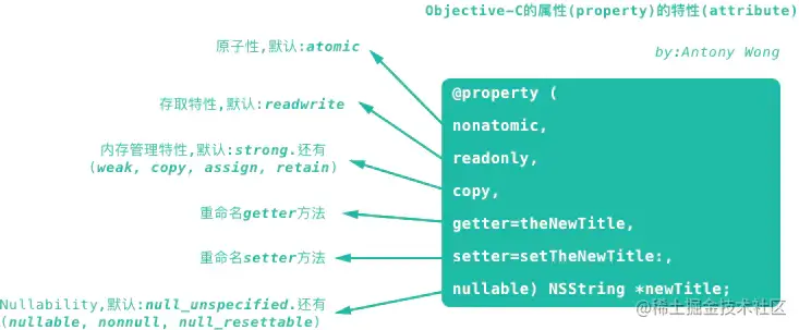 用Objective-C做过开发的朋友都知道,类里面的属性(可以近似地理解为类的变量)是用@property关键字定义的,然后@property后面的括号,会写上若干「特性(attribute)」,后面跟数据类型、属性名称。如:
