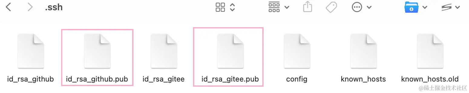 注:根据runoob官网,只用在本地~/下.ssh 文件夹中生成一个秘钥就好,但是我根据思否博主建议对每个账户(GitHub、Gitee)生成了一个秘钥然后改名并分别配置到了GitHub和Gitee中,秘钥文件如上图。