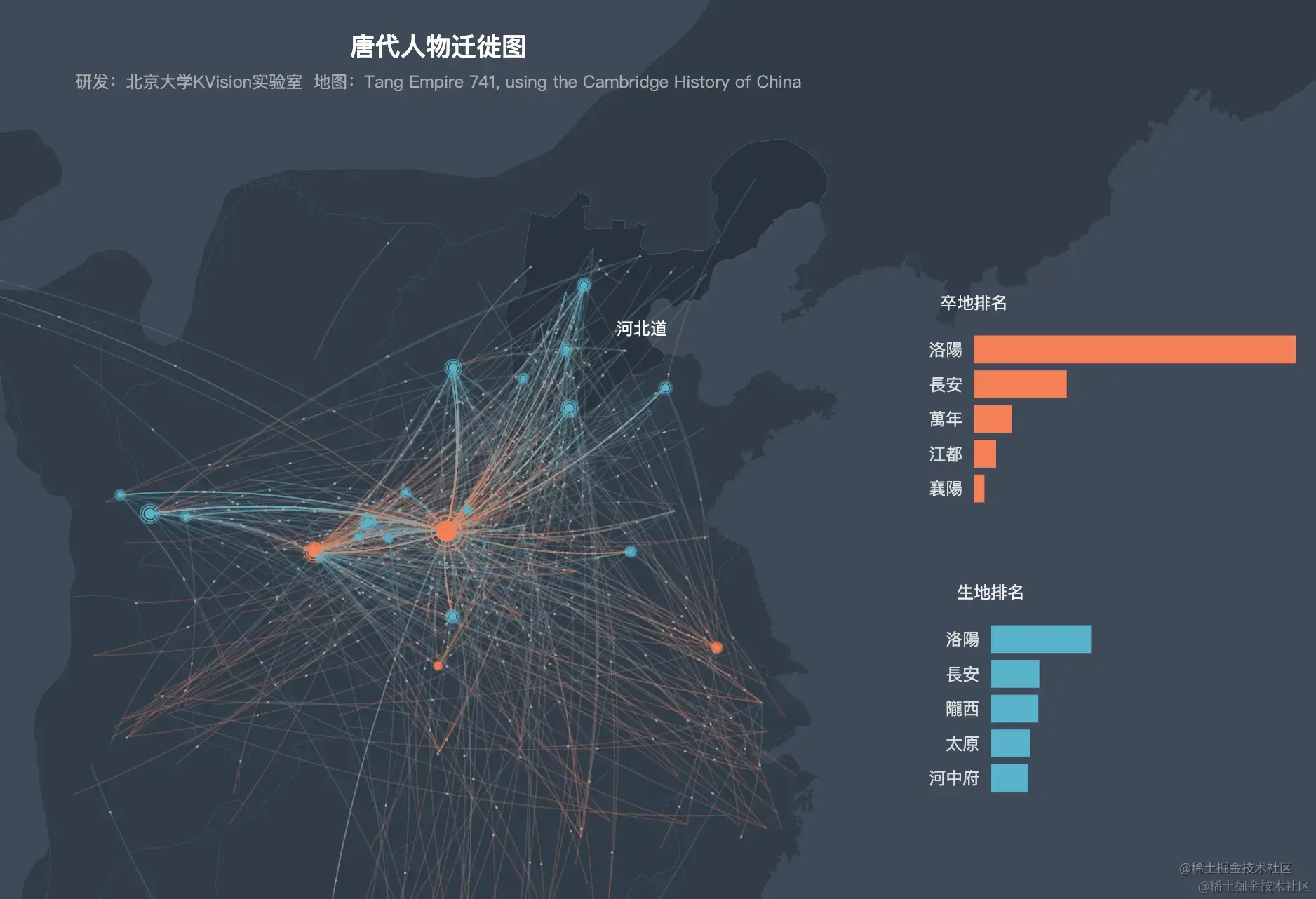 呈现数据关系的信息可视化是我们见到最多的可视化方式,比如下图通过地理信息以及连线展现唐代人物的迁徙轨迹(cbdb-qvis.pkudh.org/part1_migra…