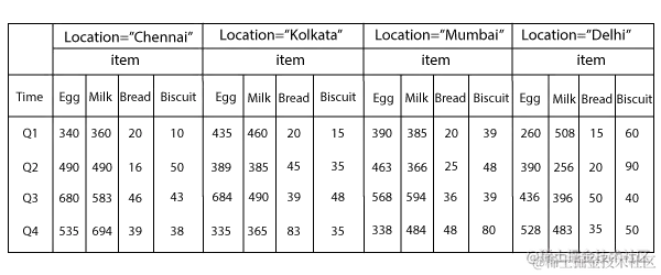 下图所示的一个多维表格数据,我们通过简单的行号或者选取一个键都没办法确定一个明确的数据条目,比如我们想得到一个销售值,那么应该描述成为“ Timeid 为1,pid 11 的销售值为25”,更复杂的数据需要更多的键来组合定位。