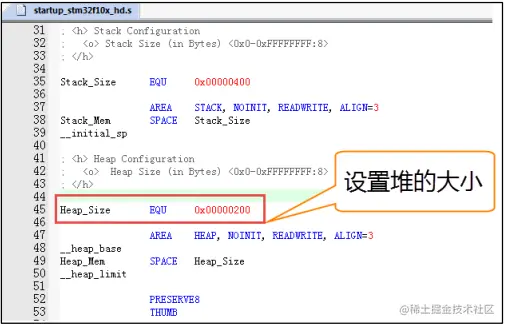 要注意的是在 使 用 heap_3.c 方 案 时 , FreeRTOSConfig.h 文件中的 configTOTAL_HEAP_SIZE 宏定义不起作用。在 STM32 系列的工程中,这个由编译器定义的堆都在启动文件里面设置,单位为字节,我们具体以 STM32F10x 系列为例