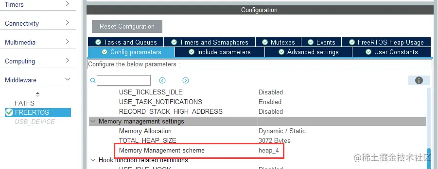 在 Config parameters 的 Memory management settings 中默认内存管理策略为 heap_4