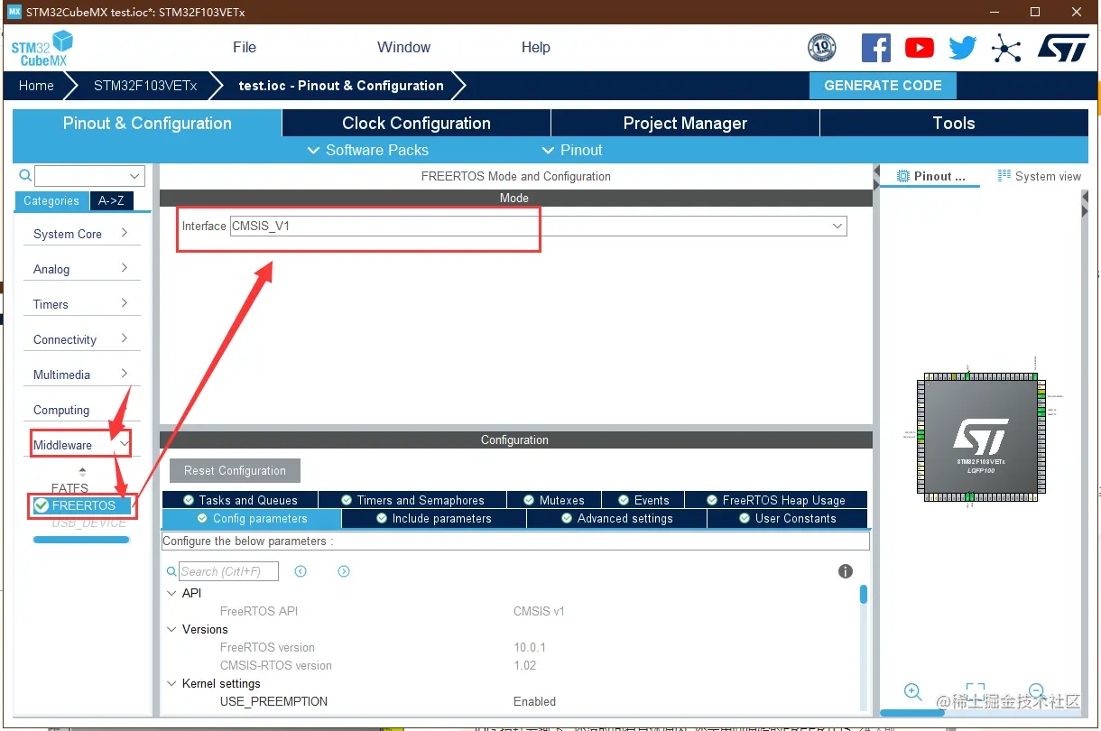 在 Middleware 中选择 FREERTOS 设置,并选择 CMSIS_V1 接口版本