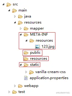 Spring Boot 默认提供了静态资源处理, 映射优先级顺序为:META-INF/resources > resources > static > public