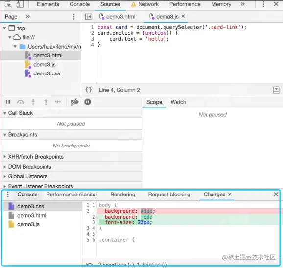 打开devTools,点击右上角的三个小点-> More tools ->Changes,就能看到所有修改了
