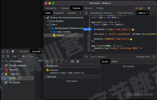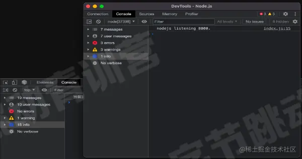 点击绿色node图标打开node调试面板(在chrome://inspect/# devices中配置network target)