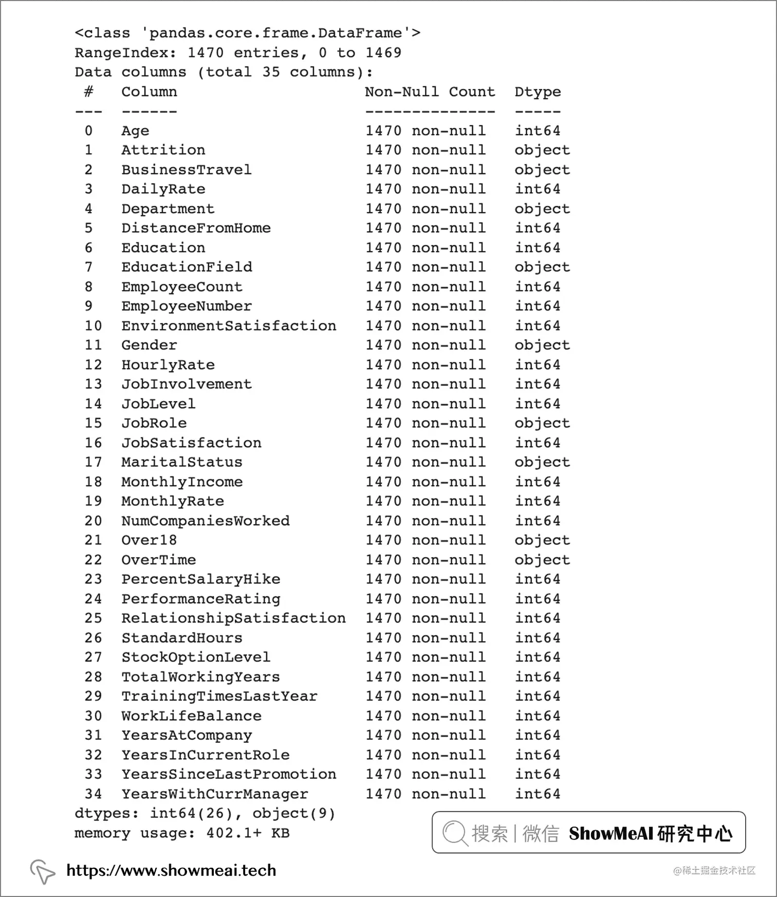 从数据集的信息可以看出,一共有 35 个特征,Attrition 是目标字段,26 个变量是整数类型变量,9 个是对象类型变量。