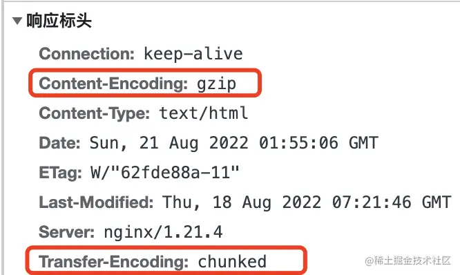 Content-Encoding:gzip 内容的格式为 gzip,告诉浏览器,需要 gzip 解压再展示。