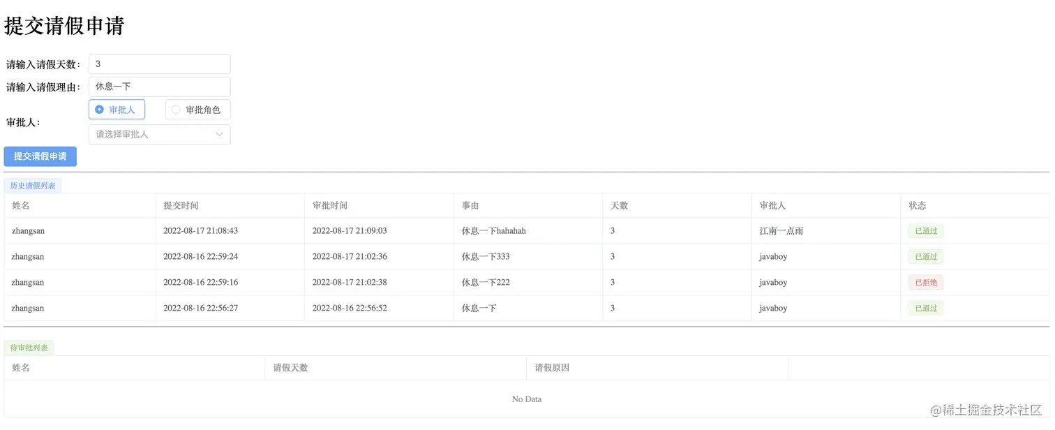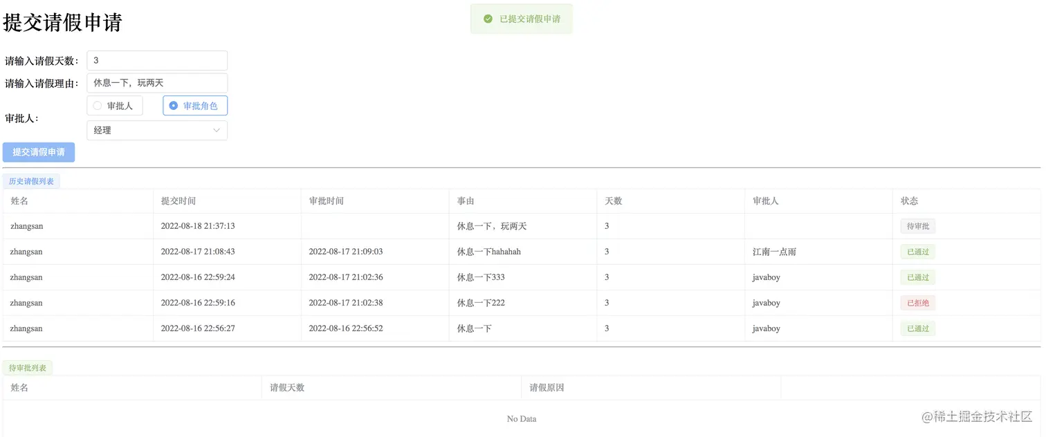 可以看到,提交请假申请之后,下面的历史请假列表中就会展示出刚刚提交的请假申请,并且状态为待审批。