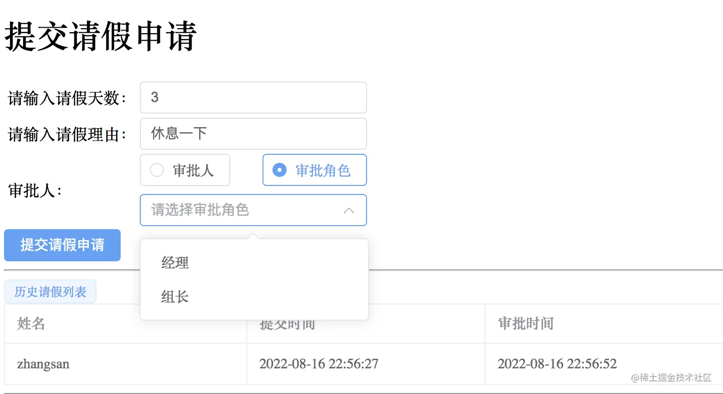- 最上面的是请假申请,用户只需要填入请假天数、请假理由,并且选择审批人即可,选择审批人的时候,可以直接指定审批人的名字,也可以选择审批人的角色,例如选择经理这个角色,那么将来只要角色为经理的任意用户登录成功之后,就可以看到自己需要审批的请假了。