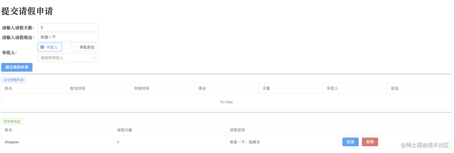 - 下面的列表是这个用户需要审批的其他用户提交的请假申请,图片中这个用户暂无要审批的任务,如果有的话,这个地方会通过表格展示出来,表格中每一行有批准和拒绝两个按钮,点击之后就可以实现自己的操作了。