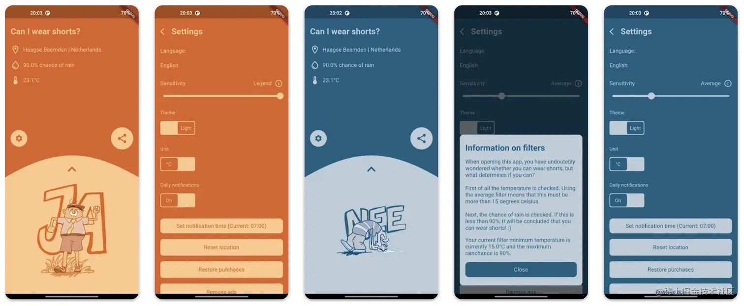 - ShortPants - 这是一个很有趣的天气应用。支持 安卓端 和 iOS 端,设计的很有意思,软件名字就叫做“短裤”,这个 APP 可以帮你选择今天穿的衣服应该是短裤还是普通牛仔裤。选择建议是基于温度和降雨概率以及其他一些决定因素。这个产品的开发灵感来自 @kortebroek 制作的网站 Kan ik een korte broek aan ,这个网站已经上线12年了,但是和这个 APP 不是同一个人开发的,有些人说这个 APP 的开发者是在抄袭。