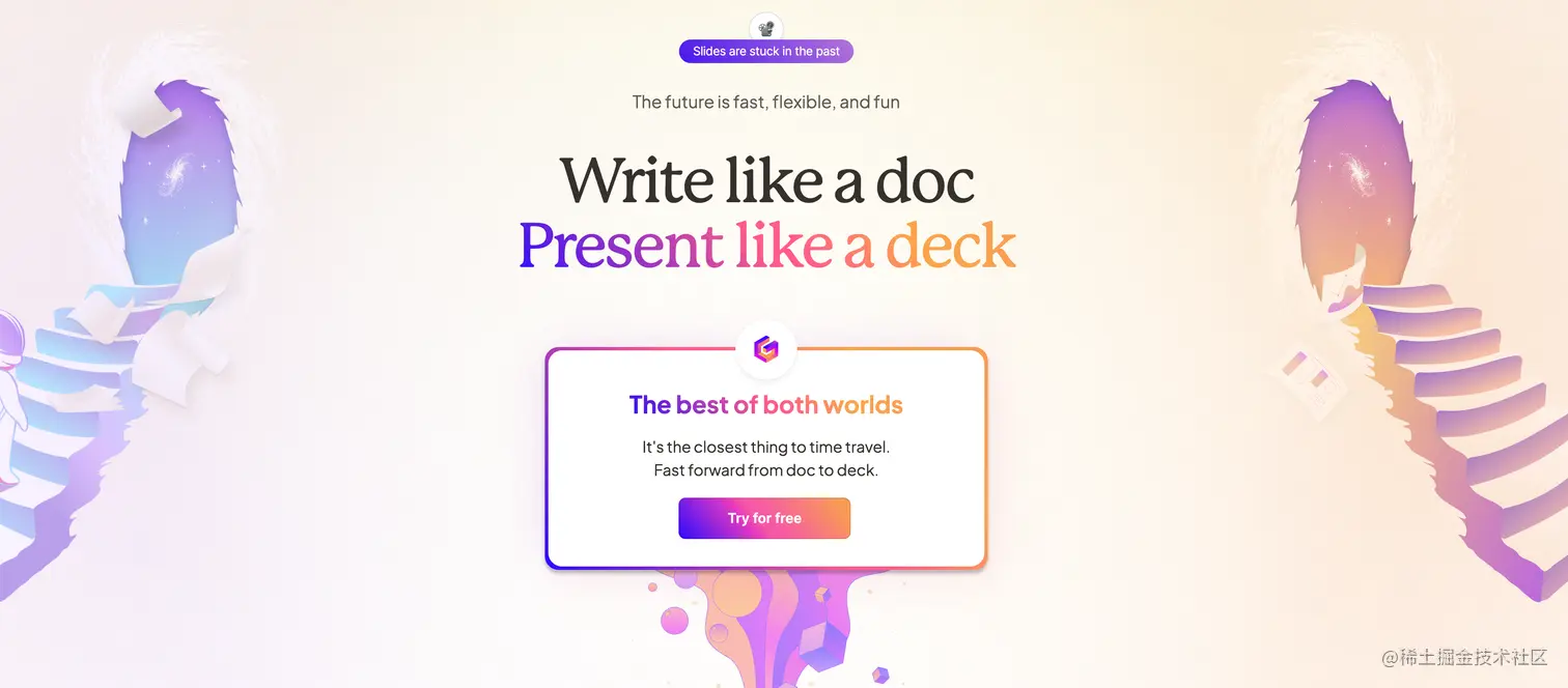- Gamma - 这个产品最近看到过很多次,用不同的方式制作PPT。你可以通过编写文档来创建卡片组和演示文稿。这个产品现在还处于测试阶段,支持自定义主题、内置模板和 PDF 导出,可以在测试期间免费使用 Pro 计划。 之后每个人是 10 美元一个月的订阅费用。