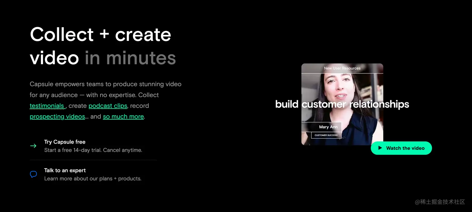 - Capsule - 这是一个在线制作视频的产品,内置了很多模板样式,使用场景也比较多,通常是是用来制作简短的介绍视频,面向企业客户多一点。$240/ month。