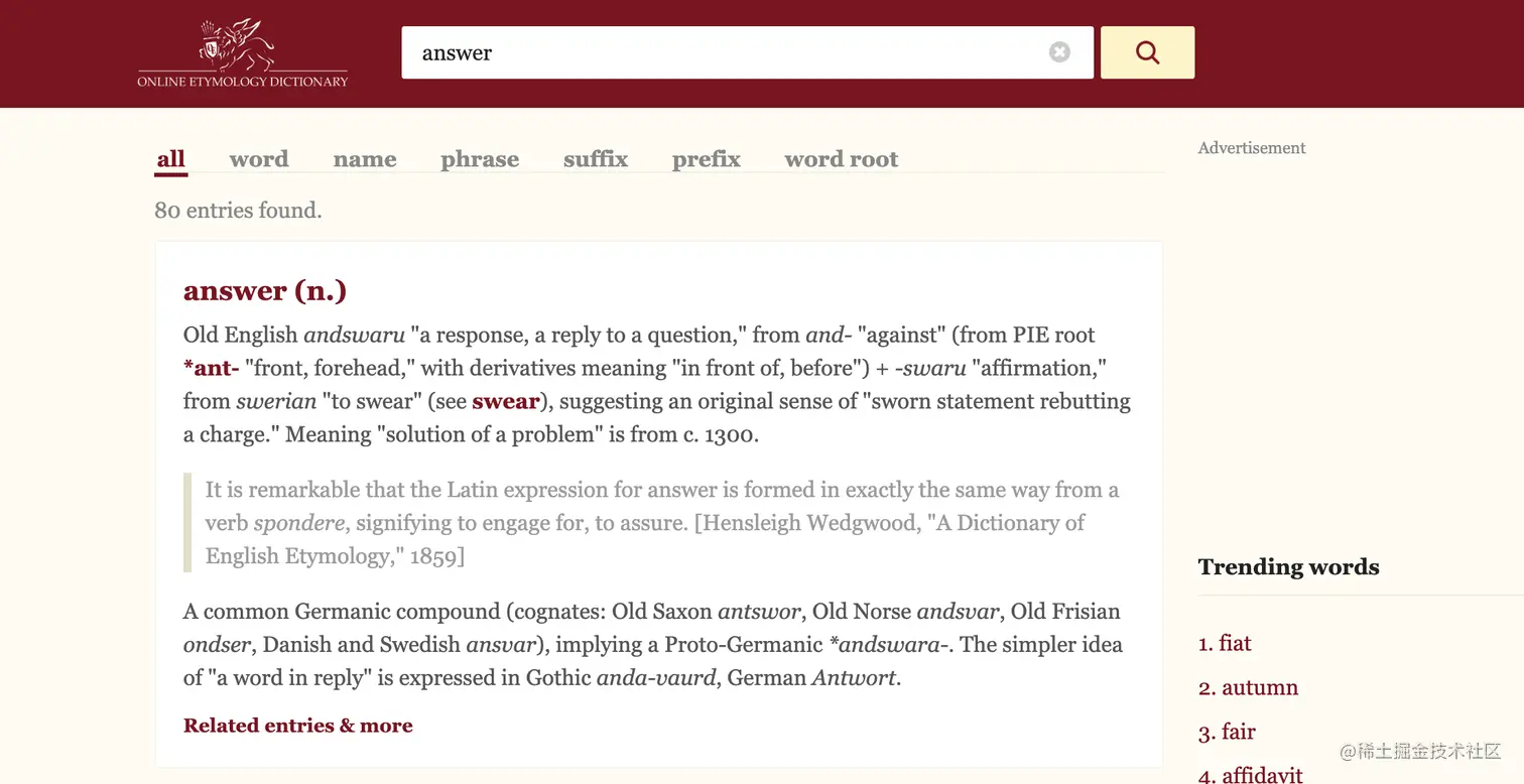 - 英文词源数据库 - 这个网站可以查询每个英语单词的历史和含义。很有用的一个工具,可以发现一些很有趣的解释。