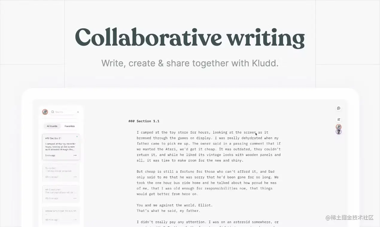 - kludd - 这是一个协同写作工具,可以实现多人在线同时写作,这个产品的定位不是用来协同办公的,是真的写作。用来写剧本、小说、故事、散文或诗歌。设计的是真的好看。但是这个定位不知道有多少人有这个需求。