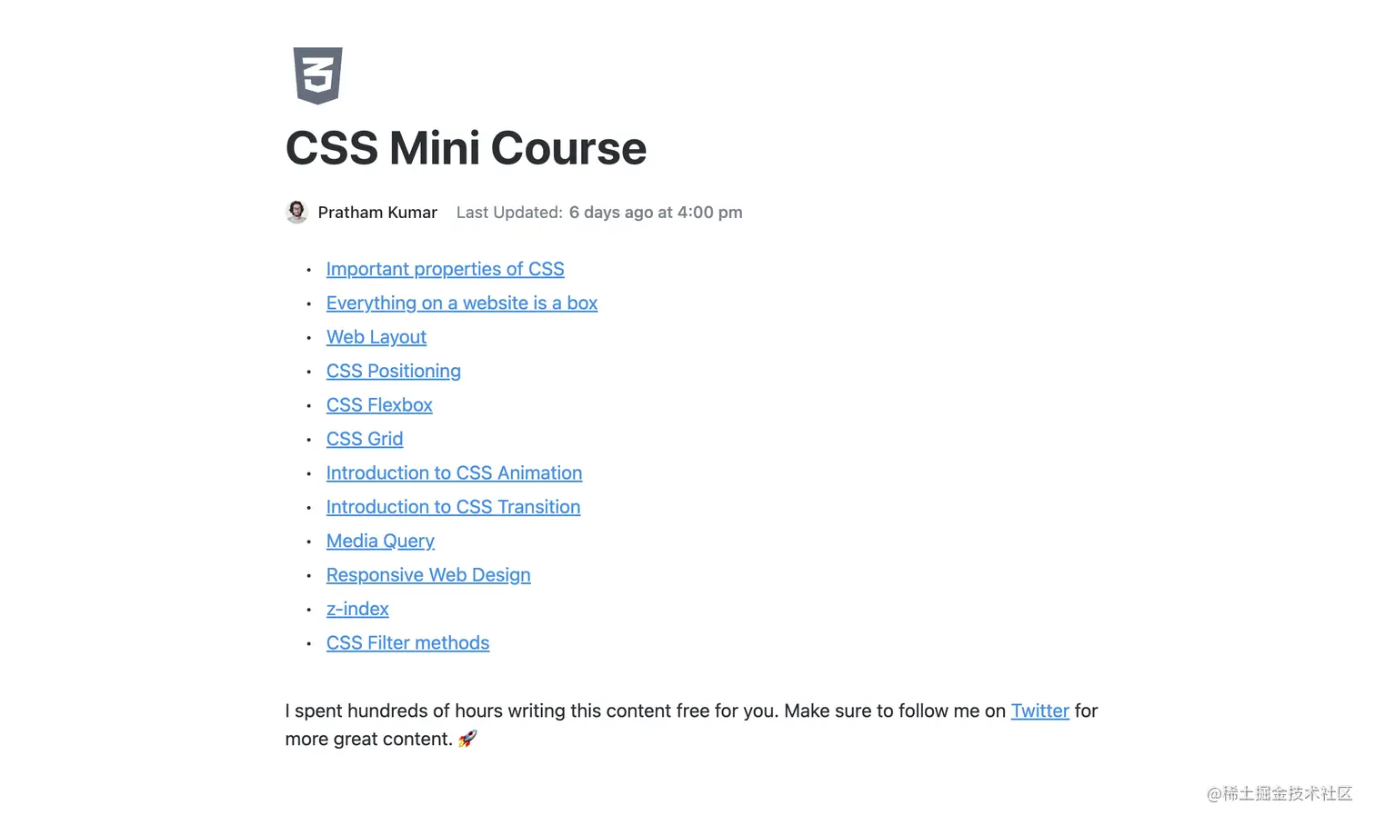 - CSS Mini Course - 作者@Pratham Kumar 为初学者整理了这个基于 Twitter 的免费 CSS 课程。