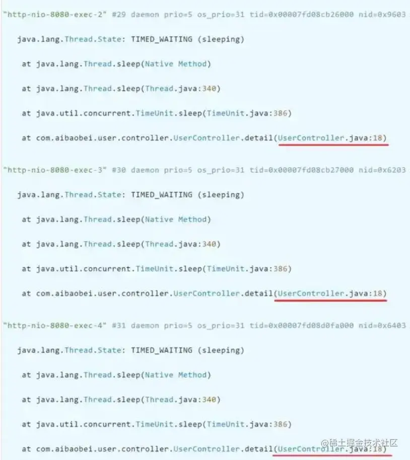 从上面的日志可以看你出,这里有多个线程都阻塞在了UserController的第18行,说明这是一个阻塞点,也就是导致该接口比较缓慢的原因。