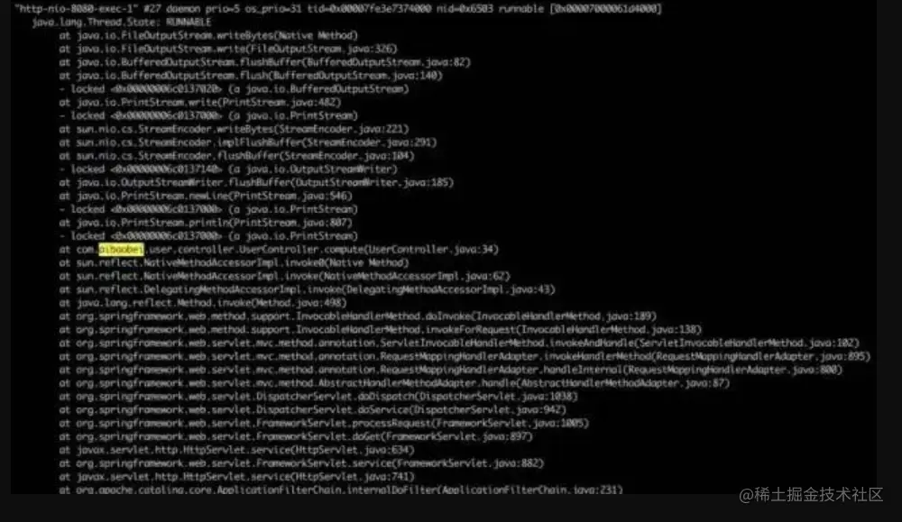 我们可以根据堆栈信息,直接定位到UserController的34行,查看代码中具体是什么原因导致计算量如此之高。