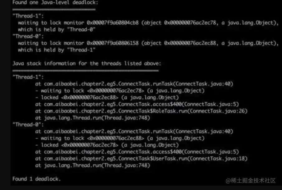 如果有死锁,会直接提示。关键字:deadlock。使用 jstack 打印线程信息会打印出业务死锁的位置。