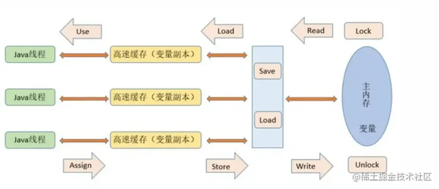 私有内存与主内存的交互由如下八种操作控制: