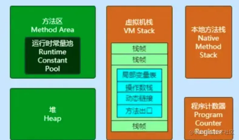 - 虚拟机栈:线程私有的,基本组成单位是栈帧,每个栈帧对应一个方法,栈帧组成如下
