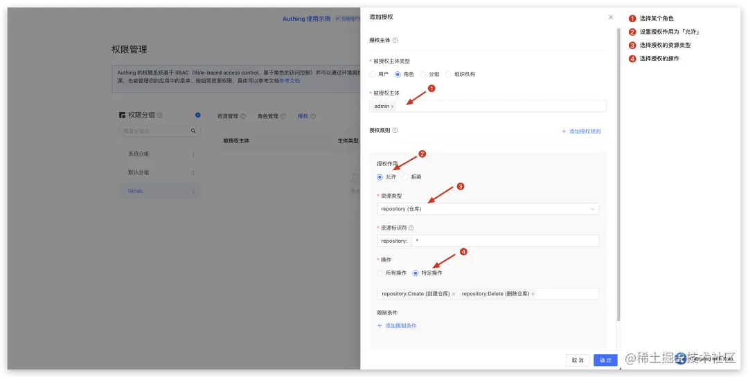 而且 Authing 还同时支持给用户、角色授权,如果用户在某个角色中,他也将继承这个角色被授权的权限。所以 Authing 既能够实现标准的 RBAC 权限模型,也能在这基础上进行更细粒度、更动态的权限控制。比如下面这个例子中,我们给 admin 这个角色授权了 repository 资源的 Create 和 Delete 权限: