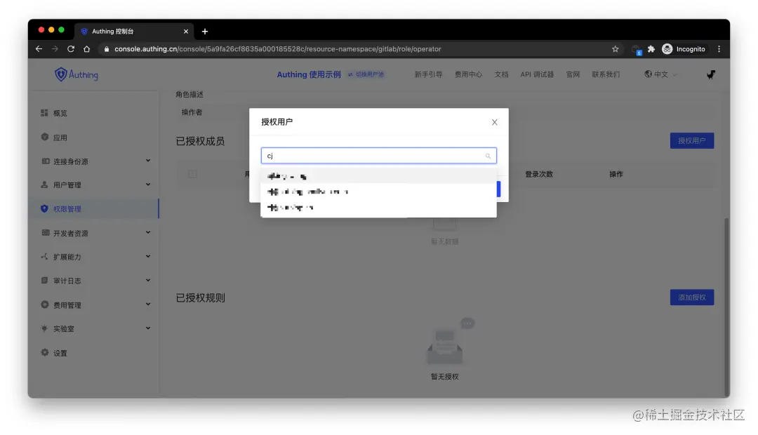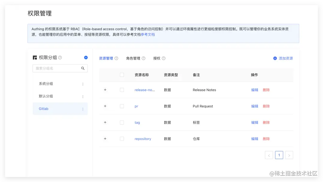 上一步我们通过用户是否具备某个角色来控制权限,这种权限控制还是比较粗粒度的,因为只判断了用户是否具备某个角色,而没有判断其是否具备某个特定的权限。Authing 在基于角色的访问控制模型(RBAC)的基础上,还能够围绕资源进行更细粒度的授权。