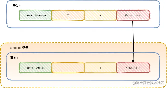 事务2:事务2把 事务1 中的name修改成了 huangle ,然后通过回滚指针来关联事务1的数据。如果事务1的数据 删除标志位 被标志为 TREU 了,那么后面就会被删除。