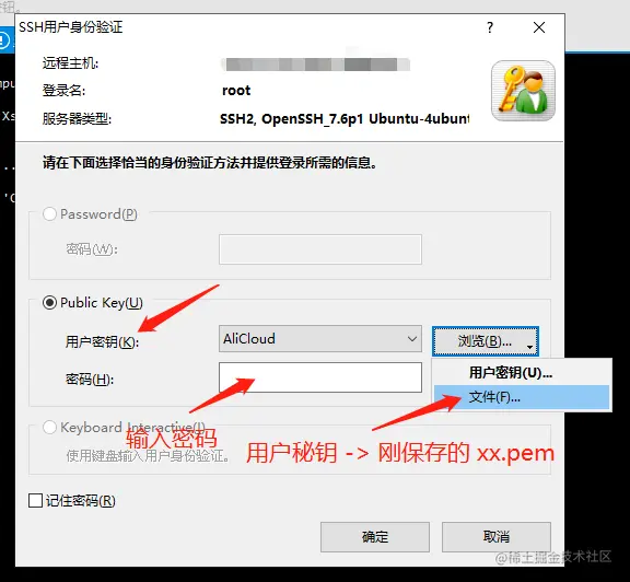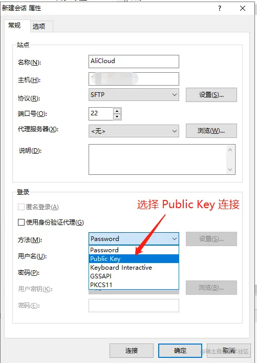 选择 Public Key 连接方式,选择生成的用户秘钥: