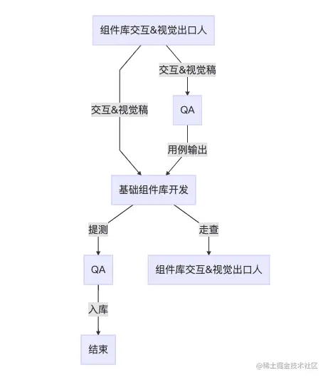 为了组件库的长远健康发展,在确定开发组件库的初期,我们便成立了组件评审委员会,并制定了组件新增的流程及规范,新增组件的流程如下图所示。从图中可以看出,在确认了需要新增一个组件之后,首先需要委员会的设计同学进行交互及视觉的设计。在视觉和交互通过评审之后,才会进入正式的开发,开发完成之后还需要各方的验证及走查才能正式入库。