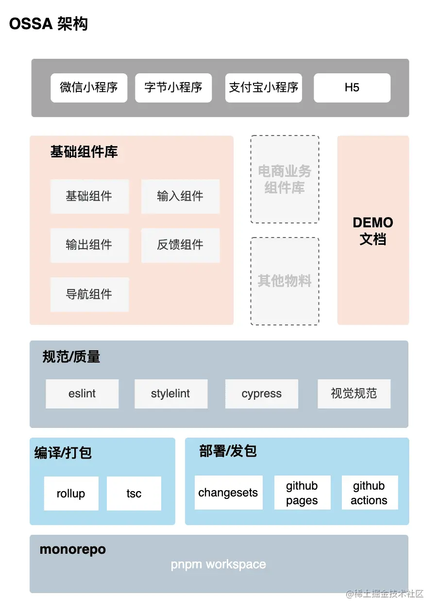 目前OSSA包括基础组件、demo,后续还会有官网、业务组件库以及其他基于Taro的物料等。为了方便项目管理,我们采用monorepo的形式管理项目。提到monorepo,首先想到的应该就是lerna,但是lerna有好长一段时间都没有在维护了(最近又开始有commit),在调研了一些开源项目之后,我们决定使用pnpm workspace来进行monorepo的管理。