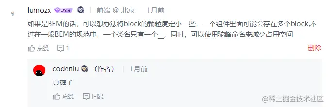 这是我在工作中切实遇到的问题,使用BEM方法命名得到的解构很清晰,但是由此而来带来的长类名也让人非常恼火,其中一位掘友的回答带给我一些启发。
