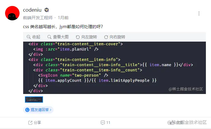 前一段我发了一个沸点向掘友求助CSS类名写的越来越长的问题,如下: