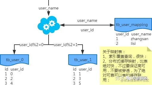 注:写入时,基因法生成user_id,如图。关于xbit基因,例如要分8张表,23=8,故x取3,即3bit基因。根据user_id查询时可直接取模路由到对应的分库或分表。根据user_name查询时,先通过user_name_code生成函数生成user_name_code再对其取模路由到对应的分库或分表。id生成常用snowflake算法。