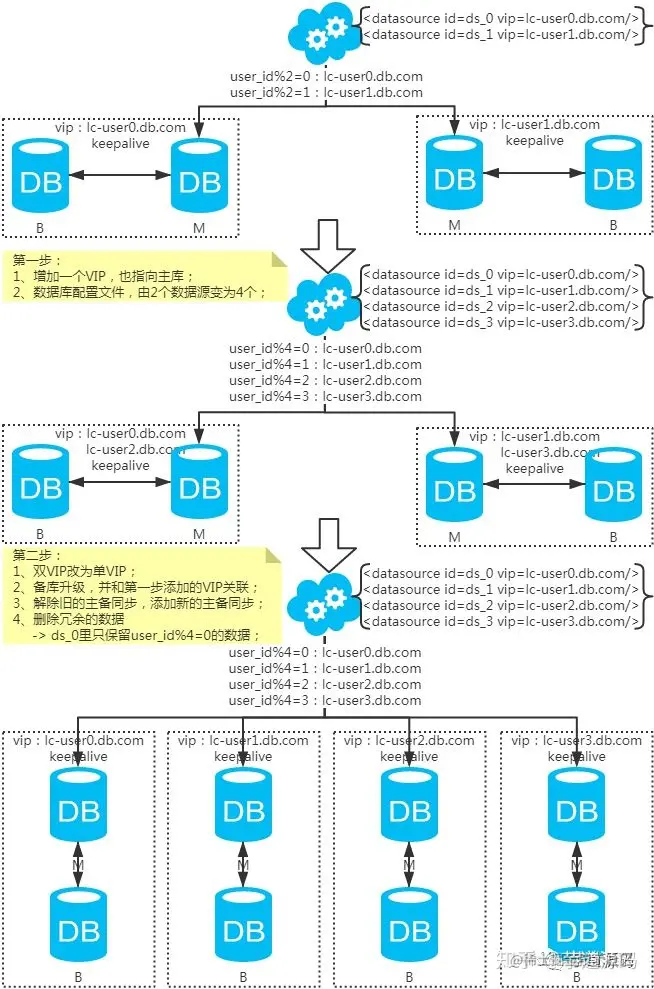 第一步:(同步双写)修改应用配置和代码,加上双写,部署;第二步:(同步双写)将老库中的老数据复制到新库中;第三步:(同步双写)以老库为准校对新库中的老数据;第四步:(同步双写)修改应用配置和代码,去掉双写,部署;