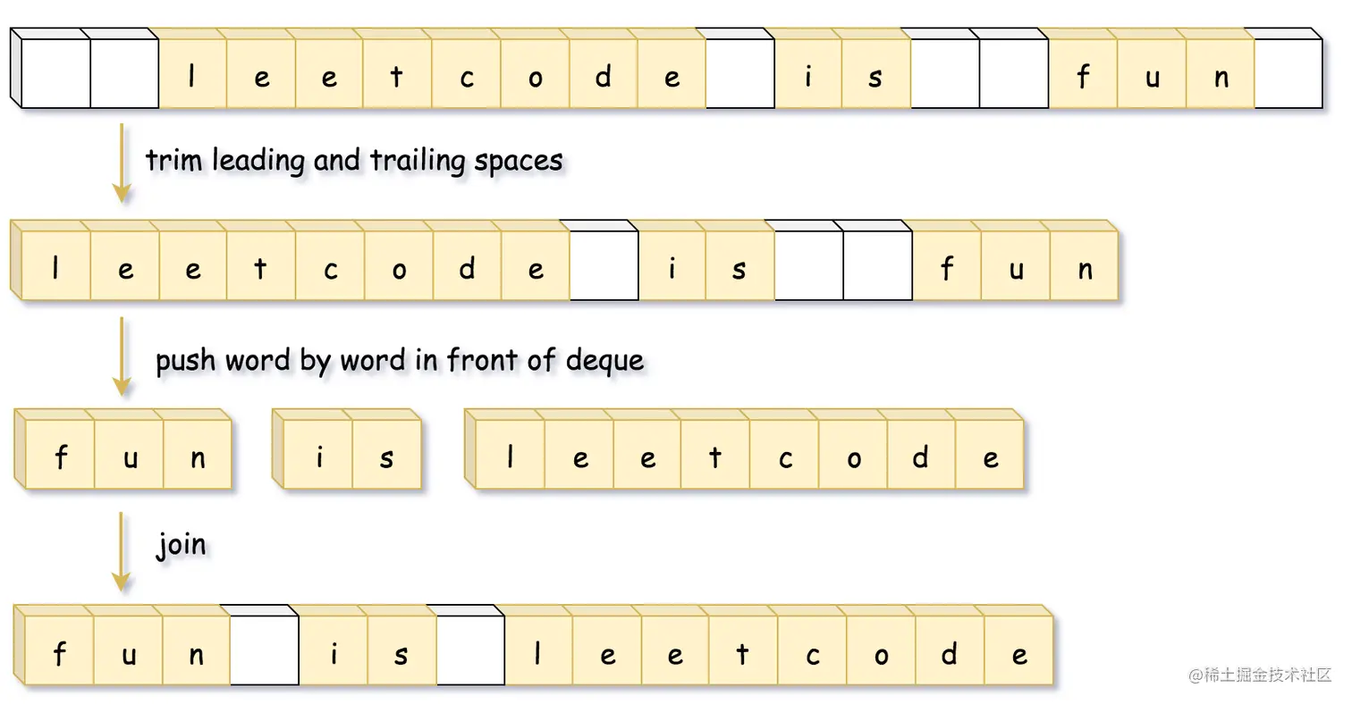 由于双端队列支持从队列头部插入的方法,因此我们可以沿着字符串一个一个单词处理,然后将单词压入队列的头部,再将队列转成字符串即可