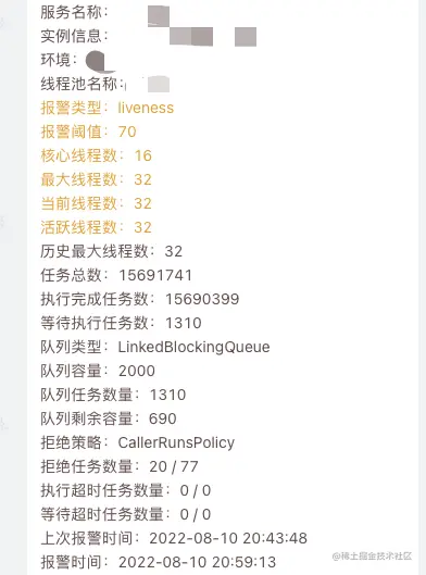 最早一版的配置是5/16/2000(corePoolSize/maximumPoolSize/workQueue.capacity),无奈不到高峰期就报警。