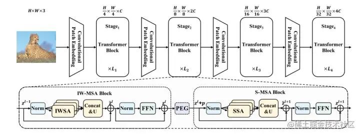 ScalableViT的总体架构如图2所示。在每个阶段,设计了一种交替排列的IW-MSA和S-MSA块来组织拓扑结构。在每个阶段的前端,在两个Transformer块之间插入一个位置编码生成器(PEG),动态生成位置嵌入。