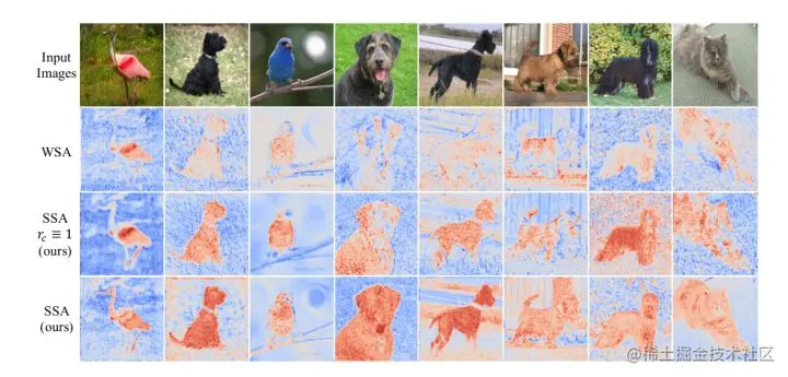 为了深入了解WSA,本文在第二个块之后可视化特征图。如图1所示,WSA捕捉到的特征是分散的,其响应倾向于局部,而不是面向对象。