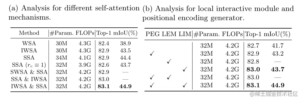表5:scalablevits对不同自我注意机制和LIM的消融实验。在表5b中检验LIM的有效性。以无位置编码生成器(PEG)、局部增强模块(LEM)或LIM的scalablevits为基准模型,在ImageNet上达到82.7%的top-1精度。