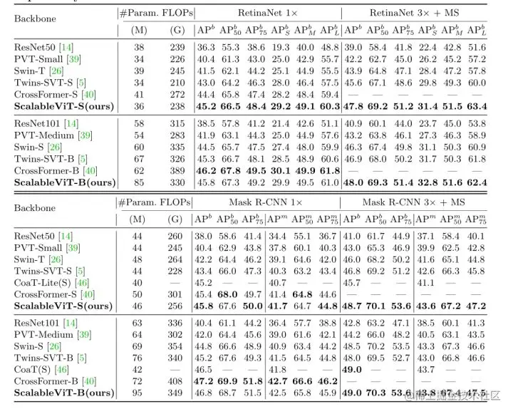 图5给出了基于scalablevits -based的RetinaNet和Mask R-CNN的一些定性对象检测和实例分割结果,从backbones的上下文表示可以使模型更好地检测对象。
