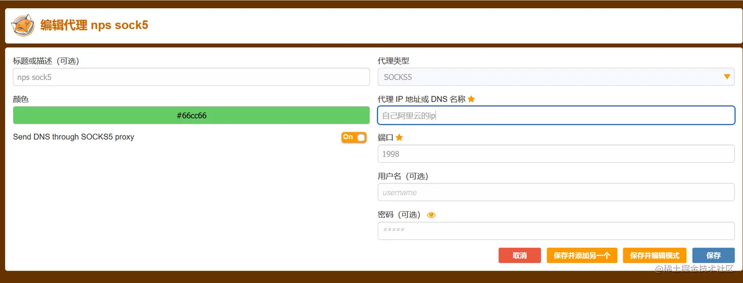 在nps上设置sock5连接隧道,然后设置火狐插件