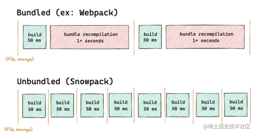 开发阶段,每次保存单个文件时,Webpack和Parcel都需要重新构建和重新打包应用程序的整个bundle。而Snowpack为你的应用程序每个文件构建一次,就可以永久缓存,文件更改时,Snowpack会重新构建该单个文件