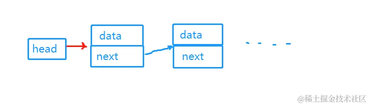 首先链表里面有个head属性,指向链表里所有节点的第一个节点,每个节点有两部分组成,一个是data,一个是next指向下一个节点的引用。