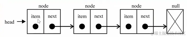 (最后一个节点的next指向 null,如果一个节点都没有,head 直接指向null就可以了,head 是指向链表里面所有节点的第一个节点)