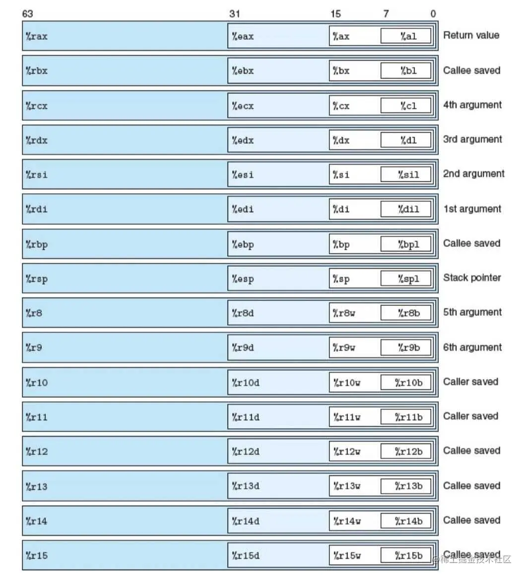 一个x86-64的中央处理器单元(CPU)包含一组16个存储64位值的通用目的寄存器。这些寄存器用来存储整数数据和指针。