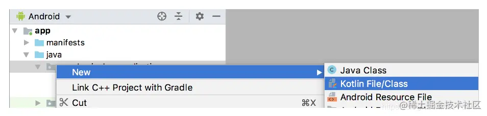首先,我们要在 AS 上面创建一个 Kotlin语言的 Android 项目,这个就不多讲了。