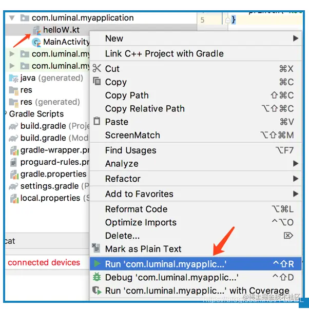 选中后缀 .kt 文件,右击如下,运行 Kotlin 代码即可