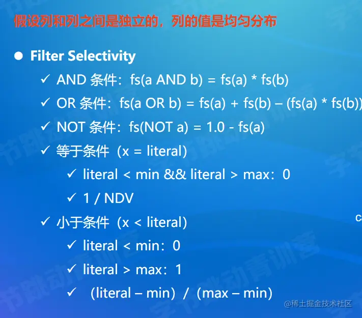 - 基数(cardinality) :基本含义是表的 unique 行数,在查询计划中常指算子需要处理的行数